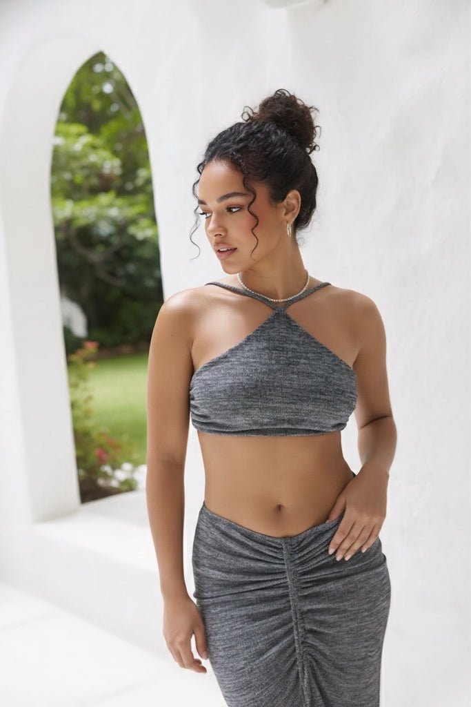 El Set Elsa es la mezcla perfecta entre comodidad, sensualidad y estilo. Compuesto por un top asimétrico de amarre al cuello y una falda larga con recogido frontal, este conjunto resalta tu figura y te da un look moderno y sofisticado al mismo tiempo.